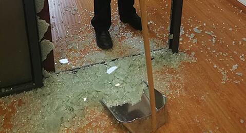 水務大廈管理部一大早就接到電話18樓的一扇玻璃門突然碎了,響聲驚天動地著實嚇壞了辦公人員。管理部立即通知保安隊長帶著鏟子、老虎鉗、掃帚等工具 |