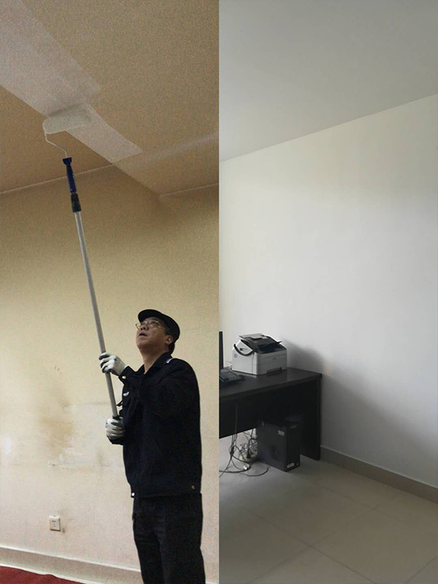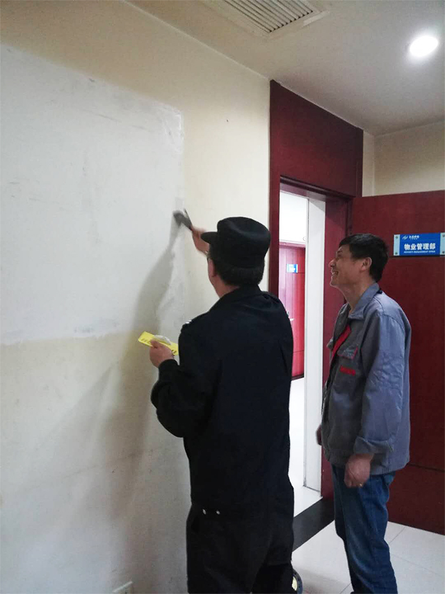 特檢院大樓造好有12年之久,值班室作為人員進出比較繁雜的場所,墻面已經失去了原本白色的光澤,整個墻體發黃。甲方為此很是苦惱,因為重新裝修對于專業人士來說工作量太小,都不肯接手這份工作。甲方領導找到物業,問有沒有辦法幫他們把這個問題解決一下。物業主管召集項目幾個管理員經過商討,安排保安人員利用休息時間幫著刷刷白。施工準備、購買材料具體工作安排,按部就班有條不紊。雖然都是非專業人事,但還是第一時間積極的參與到這份工作當中來。看著簡單的墻面刷白,難度也是不小的,首先就是墻體打磨,打磨不到一定程度油漆很難粘附上去。膩子干濕度也要適中,最后就是涂油漆,力道輕重直接影響到了墻面的光滑度。經過大家一周的辛苦勞動,終于給甲方交出了一份滿意的答卷。雖然非專業,只要動腦筋,干活我們絕對行!