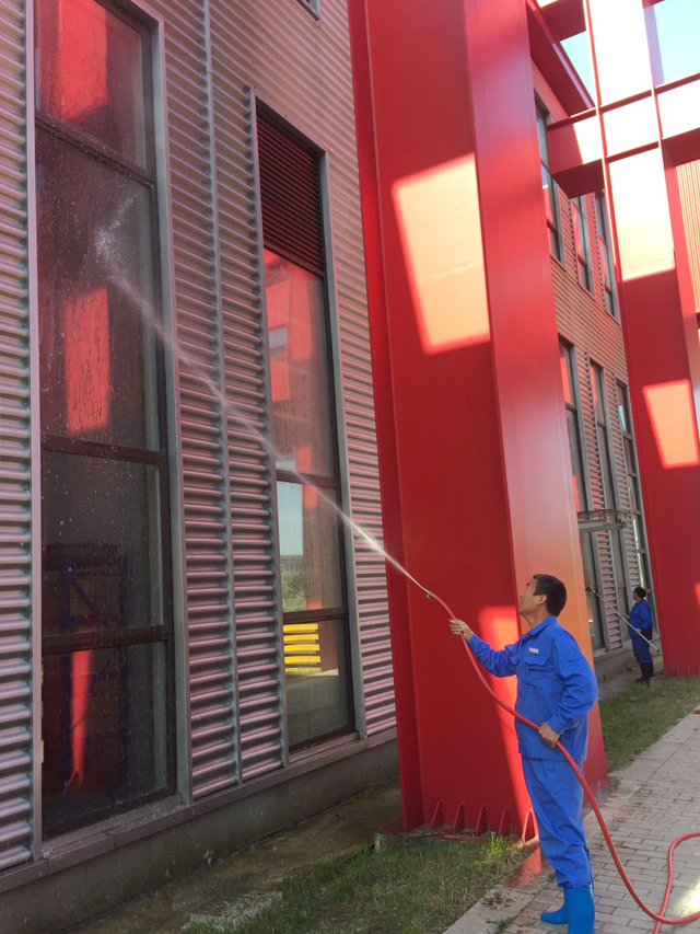 5月3日專項、保潔人員早早的到崗。一人負責開關消火栓接放水管、一個負責沖洗高處墻面、一個跟著刮洗玻璃、一人負責收沖到車間內的水,沖洗外墻工作有序開展。當下午13:00沖洗到5號車間前臺時,甲方值班領導開來了展臂登高車,協助我們刷洗5號前臺玻璃屋檐。