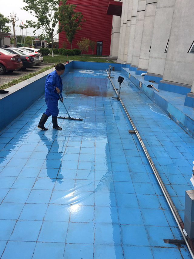 5月初同方威視1號成像車間南外圍水池邊上的竹林移栽別處,3個連環水池露了出來,甲方決定蓄水啟用水池。因水池長期不用,導致水池底部形成了大量水垢、水泥、污染物,并且屋頂的9個排污口的污水也直接排放該水池中。污染嚴重人員又少,清洗工作比較困難。