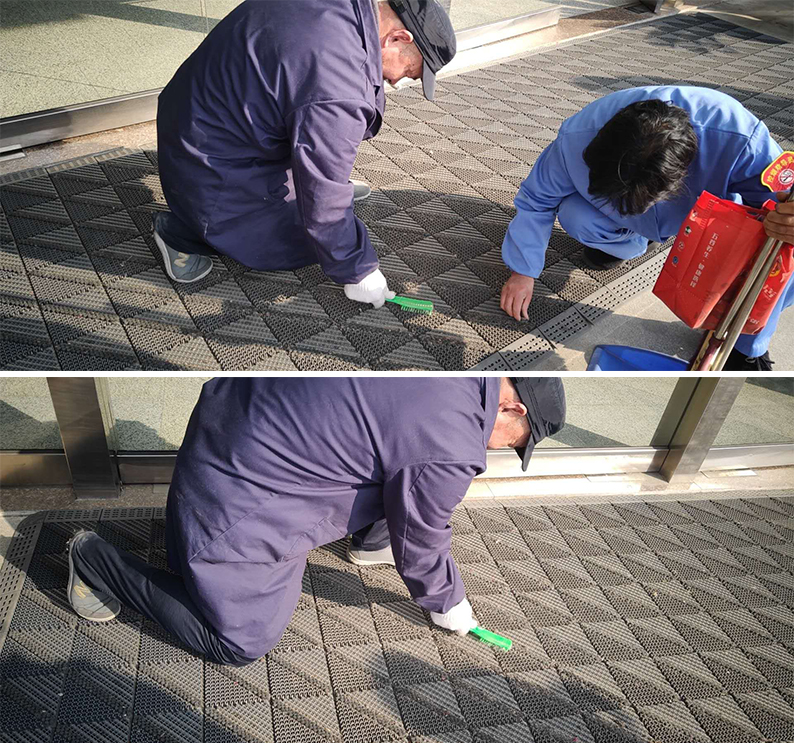 “好醫管”醫療事業部啟東市人民醫院項目部,5月18日下午,趁著休息天人少,機動師傅計劃把內科西門的防滑墊子清潔一下。他拿上保潔工具,叫上大廳里的保潔阿姨,兩個人開始對防滑墊子進行徹底的打掃。他們先把防滑墊子移到臺階上,然后用手拍打墊子,使卡在墊子里的灰塵和臟東西全部掉下來,接著阿姨把地上的臟東西先清理干凈,然后兩個人把防滑墊子拖回原地,由于有些絨毛當時不能被拍打下來,所以接下來清理絨毛的任務只能慢慢地解決了。只見他們用手指一點一點地把絨毛從墊子的夾縫間摳出來,還有些害羞的躲在角落里不肯出來的,王師傅只能動用武力——使用鞋刷把它們全部拉上來。蹲的時間長了,腿有點酸了,他們就站一會兒,休息了一下又接著干。最后終于把那么一大張的防滑墊子徹底清理干凈了。看著那么干凈的防滑墊子,又看看他們又臟又紅的手,真心的為他們的點贊!