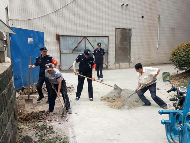 下午兩點,物業管理人員帶領保安、保潔開始整改。首先,由保潔把地面打掃干凈,然后保安鏟掉多余的泥土,有的保安用鐵鍬,有的保安用尖鎬,相互配合,很快一小片地面就鏟好了。其余的員工一起把黃沙、水泥倒在地面上加入水攪拌一下。拌好水泥再用鐵鍬放入挖好的地面上。最后用木板一點一點的把水泥攤平,整個整改工作持續了一個多小時。為了安全,我們對硬化好的地面周圍一圈用水泥袋還有路障圍了起來。