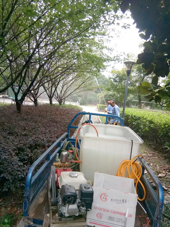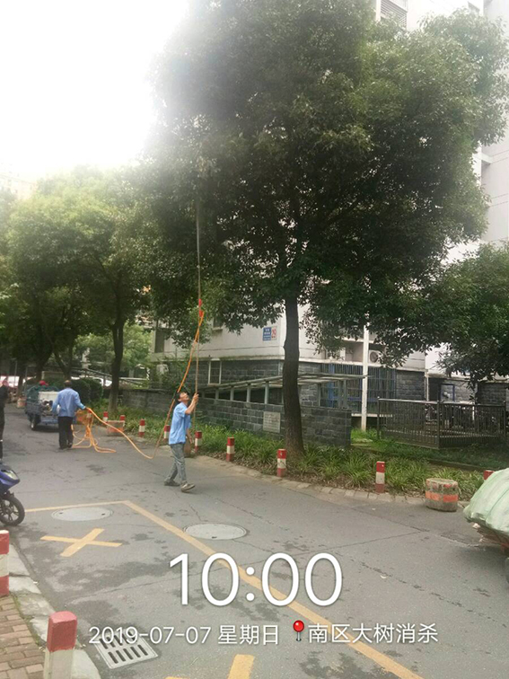 2019年7月7日,綠化師傅趁著天好,將配置好的消殺藥水用容器裝載在三輪車內(nèi),便展開(kāi)了小區(qū)的打藥工作。三位綠化師傅相互配合,一位師傅開(kāi)車,一位師傅拉著水管,另一位綠化師傅拿著管子負(fù)責(zé)給櫻花樹(shù)和大樹(shù)噴灑藥水,用了兩天時(shí)間最終完成了對(duì)南、北、西苑所有大樹(shù)的消殺工作。