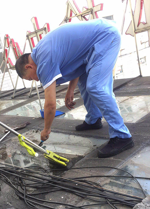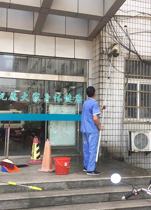 “好醫館”醫療事業部啟東人民醫院項目部,2019年7月18日,項目經理接到總務科通知,由于之前拆除了老樓,北區體檢中心外的雨棚上有大量積灰,需要徹底的清除打掃一下。接到通知后,項目經理第一時間通知了門診主管安排了任務,門診主管到現場看了下衛生情況,外雨棚上堆了一些雜物,還有青苔,上面也比較濕滑,查看完情況后便通知了機動工友帶上相關的保潔工具趕到現場打掃衛生。機動工友將上面的電線固定起來,再用鏟刀將上面的積灰、青苔鏟除,再用清潔劑、海綿拖把拖干凈,最后再將雨棚下面的玻璃都擦干凈。急時有效地完成了總務科安排的任務,我們的服務也得到了體檢中心科室主任以及護士長的一致好評。