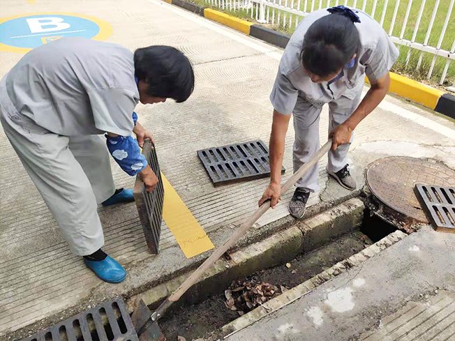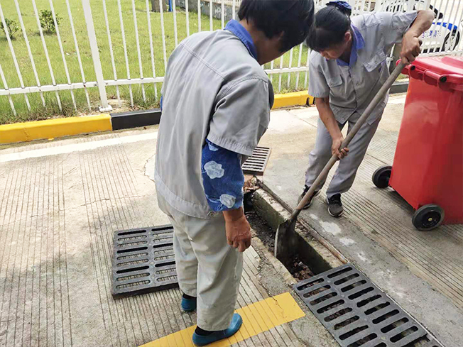 科目二地勢低洼很容易形成積水,現在夏天暴雨頻繁,為防止出現安全隱患,對此物業利用考試結束的時間對區域內的排水溝進行清理工作,利用鐵鍬等工作,對每個區域內的排水溝進行清理。有些鐵質蓋板并不能拿起來,保潔員利用火鉗工具對其垃圾枯樹葉進行夾除工作。夏日炎炎我們也提醒員工進行防暑降溫工作,確保工作順利開展的同時,對員工的健康進行把控,合理安排人員對其進行清理。