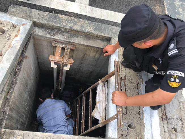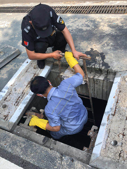 維修和保安兩人現場配合,下井挪動水泵位置,盡量將水泵與接口對上,再調整固定杠子的間距,使間隙減小,保障正常生活污水排放。