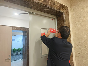 他們首先小心翼翼地將舊貼紙從安全門上撕下。隨后,使用清潔劑清除殘留的膠痕與污漬,保持安全門表面干凈整潔。最后,將新貼紙平整地粘貼在門上,并輕輕按壓以確保貼紙與門緊密貼合。