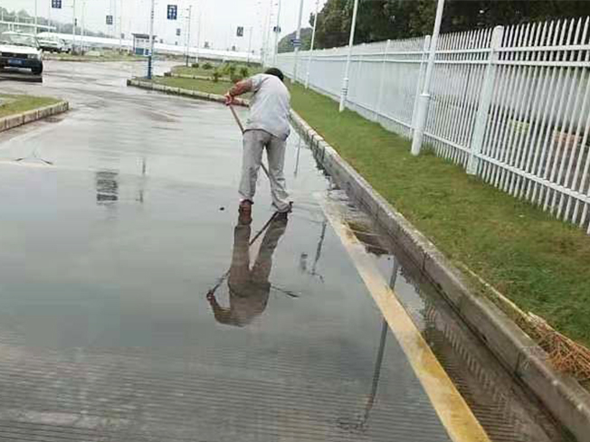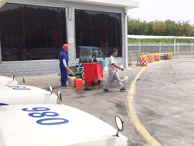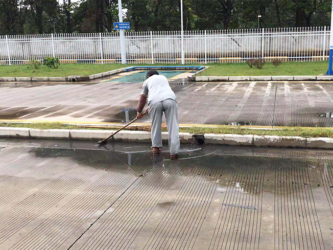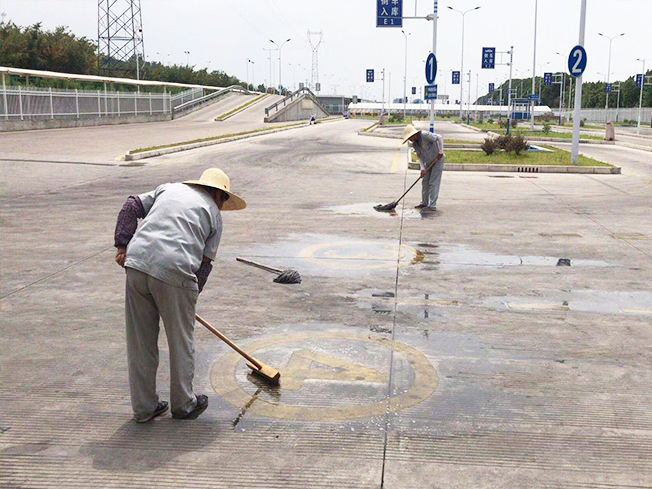我們利用不考試不訓練的時間空檔,對場地及地標進行了一個清理工作。因工具有限,我們保潔人員只能一桶一桶的把水拎到所要清洗的地方,一個維保人員進行放水、裝水工作,這給我們的清洗工作延長了不少的時間,也降低了保潔人員清刷的速度。保潔員把水拎到所要清洗的地標線,先用少量的水將臟地浸泡,再用硬毛地刷進行初步的清刷工作,再利用拖把進行一個拖擦,最后再用清水進行一個沖洗的收尾工作。為確保地標線的干凈整潔度,及學員考試的順利進行,我們對E區所有嚴重黑漬的地標線進行了清理工作。然因為下雨使E區場地比較低洼,積水嚴重的地方沉淀了一層厚厚的黑漬,我們又對E區場地進行了二次清理,利用雨水、積水對場地進行清刷,然后用大竹掃帚將污水掃進下水溝里,使E區變得干凈整潔。