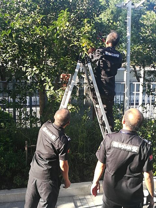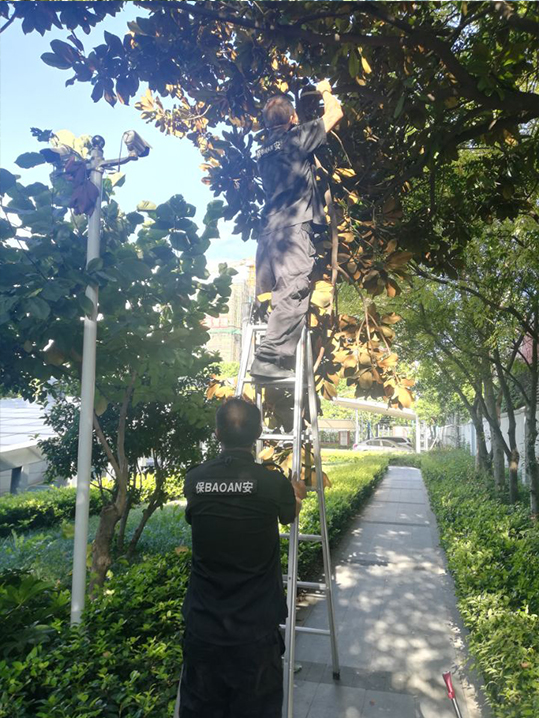 2019年9月18日,國慶來臨之際,特檢院主管對園區監控設施設備例行檢查,發現有幾個點的監控畫面不能正常顯現,查找原因是監控頭有壞損和被樹枝遮擋現象。把這一問題及時匯報甲方,壞損的監控頭甲方聯系維保來進行維修,被樹枝遮擋的監控畫面物業主管則安排物業人員協助修剪調試。由于是高空作業,物業主管對工作做了合理的安排,找工具、拿梯子、扶梯子,工作安排有條不紊,井然有序。