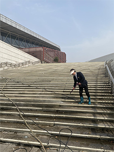 在清洗過程中,保潔人員們遇到了不少挑戰。由于樓梯上的灰塵較多,他們不得不穿著厚重的雨靴進行作業,以防污水濺到身上。高壓水槍的使用也頗具技巧,保潔人員需要對準每一個污漬,一點一點地進行沖刷。對于一些特別頑固的污漬,他們更是毫不留情,用力地對著污漬沖刷,直到其徹底消失。