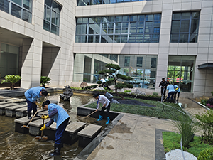物業(yè)商議決定把景觀池清洗一下,給大家一個(gè)干凈整潔的辦公環(huán)境也還小魚(yú)兒一個(gè)干凈溫馨的家。保安師傅先把浮在水中的樹(shù)葉打撈干凈,把小魚(yú)兒撈出來(lái)先放水桶中,然后把景觀池的水放掉。接著保潔、保安齊上陣,找來(lái)了清理工具,刷子、手套、雨靴、鋼絲球以及推水把。由于池底粘滑,難以清洗,大家劃分區(qū)域,拿著鋼絲球一點(diǎn)點(diǎn)刷洗,然后再拿推水把清理污垢。通過(guò)大家齊心協(xié)力的勞作,原本渾濁的魚(yú)池變得清澈見(jiàn)底,大家看著自己的勞動(dòng)成果,臉上都露出了欣慰的笑容。