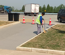 服務(wù)區(qū)瀝青廣場(chǎng)上,耀眼的陽(yáng)光毫無(wú)遮攔地傾灑而下,地面溫度已近40度。幾個(gè)頭戴遮陽(yáng)帽的物業(yè)人,有的一手拿著簸箕,一手拿著掃把有力地?fù)]舞著,有的拿著水桶、毛巾,擦廣場(chǎng)的消防實(shí)施設(shè)備、垃圾桶、廣告牌,這看似簡(jiǎn)單的工作,實(shí)則非常考驗(yàn)?zāi)土图?xì)心,忙碌一陣,他們額頭上就布滿了汗珠,身上的衣服也被汗水浸濕?杉幢闳绱耍麄円琅f精心清潔著每一處,確保服務(wù)區(qū)干凈整潔。