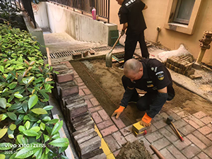 施工過程中,保安師傅們分工明確,配合默契。有的負責搬運沉重的道板石,有的專注于道板石的鋪設與調整,確保每一塊道板石都穩固平整。盡管工作辛苦,但大家毫無怨言,只為能在梅雨到來前完成鋪設,保障居民的出行安全。