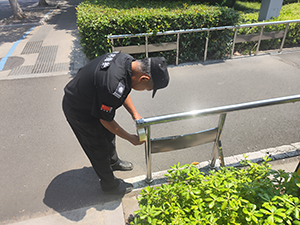 近日,高鐵北站西非機動崗位的安保員李成業(yè)如往常一樣,在管轄區(qū)內(nèi)進(jìn)行細(xì)致巡查。當(dāng)他行至一處時,敏銳地發(fā)現(xiàn)不銹鋼護(hù)欄端部的透明塑料缺失,原本被包裹的金屬管口暴露在外。這看似不起眼的細(xì)節(jié),卻可能帶來安全隱患,行人稍有不慎便可能被鋒利的管口劃傷。