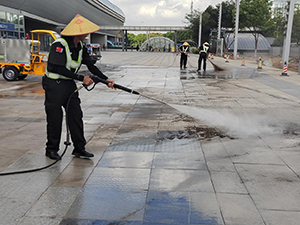 在風(fēng)雨連廊施工圍擋拆除后,廣場上遺留了不少建筑垃圾、灰塵和雜物。面對這一情況,保安員和保潔員們沒有絲毫懈怠。保潔員們手持掃帚、簸箕等工具,分工明確,對廣場地面的塵土、碎石等進行細(xì)致清掃。他們不放過任何一個角落,哪怕是藏在縫隙里的微小垃圾,也一一清理出來。同時,部分保安員還使用高壓水槍,對地面上頑固的污漬進行沖洗。經(jīng)過水流的強力沖刷,原本沾滿污漬的地面逐漸恢復(fù)潔凈