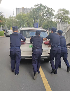 1號崗可是奧體中心車輛進出的關(guān)鍵通道,電車停在這里,不僅會引發(fā)交通擁堵,還可能潛藏著安全隱患。徐偉文立即將這一情況上報給了主管。項目經(jīng)理周經(jīng)理得知消息后,第一時間火速趕到現(xiàn)場。當機立斷做出安排,迅速調(diào)來4名保安前來支援。這4名保安接到指令后,迅速集合到位。他們分工明確、配合默契,迅速投入到救援行動中。有的保安在電車后面,雙手穩(wěn)穩(wěn)地抵住車身,齊心協(xié)力地推動;有的則在一旁適時指揮,確保推車過程安全有序。而車主則坐在車里,全神貫注地掌握著方向。