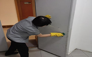 處理過程中,朱阿姨展現出非凡的耐心與專業素養。她反復調整清潔劑配比,采用物理擦拭與化學分解相結合的方式,對門框縫隙、閉門器等關鍵部位進行深度護理。為避免清潔液流入防火密封條,連續奮戰數小時直至污漬徹底清除。期間婉拒同事換班提議,堅持“問題不過夜”的服務準則。