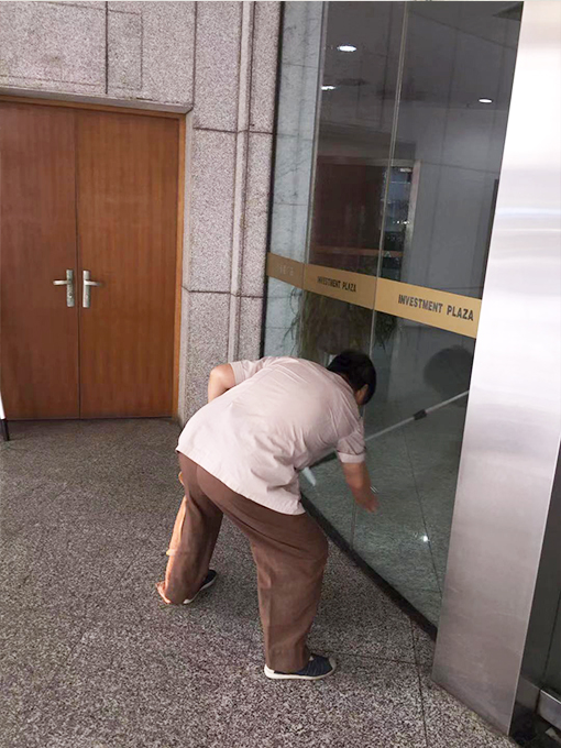 常州的投資廣場是建于20世紀90年代的老大樓,曾經(jīng)也是常州的地表建筑也是老常州人的驕傲。時間飛速時代更迭,周圍的高樓聳立,投資廣場沒有了昔日的光芒。但是在投資廣場項目部所有的工作人員相信它可以煥發(fā)新的生機。為了讓每位業(yè)主和來往的客戶都有一個舒適的工作和學習的環(huán)境,每天一大早投資廣場保潔部的工作人員對大樓大廳的落地玻璃進行清潔。由于是大面積的落地玻璃,一個人難以擦拭,她們就兩兩協(xié)助,一個人拿玻璃擦在里面進行第一遍的清洗,另外一個人在拿玻璃刮在輕輕的刮擦。由于腰彎上彎下,不一會就累的夠嗆,連腰都直不起來。終于在業(yè)主和客戶上班之前大廳玻璃擦完。業(yè)主到達以后看見明亮潔凈的大廳,一天都會有好心情。投資廣場項目部所有的員工堅信只要付出就會有回報。老大樓也會煥發(fā)新的生機,更加和諧的為業(yè)主服務(wù)。