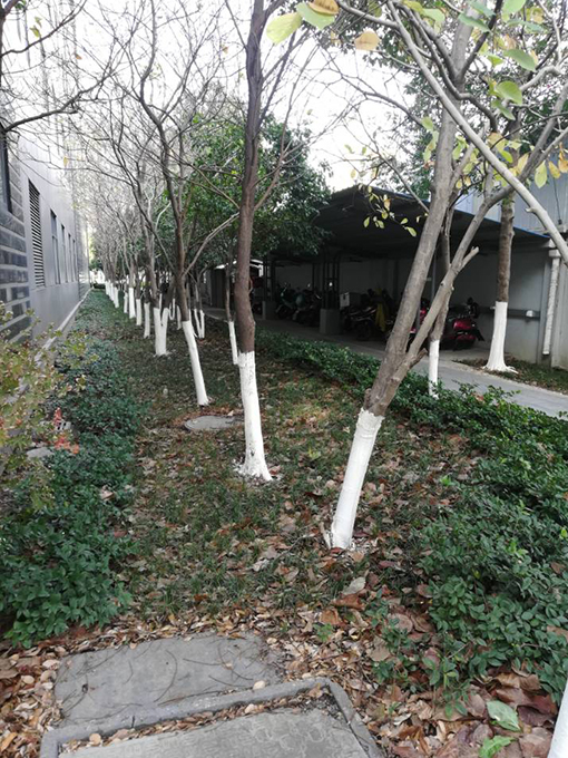 一年一度的冬季已經來臨,人們都穿上了厚厚的冬裝,做上了保暖措施。園區里面的大樹是不是也要過冬了呢?特檢院項目部主管通過網上查詢發現冬天樹木涂白可以起到防凍的功效,預防冬季的凍害,還能防止病菌侵入,提高樹的長勢,涂白劑有一定的營養,可以促進果皮的健康,提高樹木的抗病能力,既防凍又有殺蟲的雙重作用。特別是對在樹皮里過冬的螨類、蚧類等殺傷力尤佳,樹木涂白亦可起到美化作用。