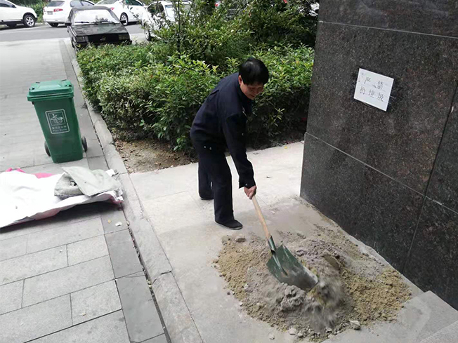 經與樂聚物業負責人協商,對方允許敷設水泥,澆灌路面,但施工須由我方自行解決。在獲得業主移動方領導同意后,移動高正物業項目部立即響應,組織保安、保潔人員想辦法弄來石子、水泥、黃沙等基礎材料及施工工具,齊力施工。